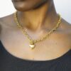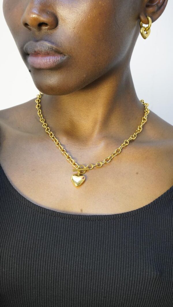 A stunning piece featuring a heart-shaped pendant. The pendant hangs from an 18k gold plated stainless steel chain. Elevate your wardrobe with this one-of-a-kind statement piece making it perfect for layering.